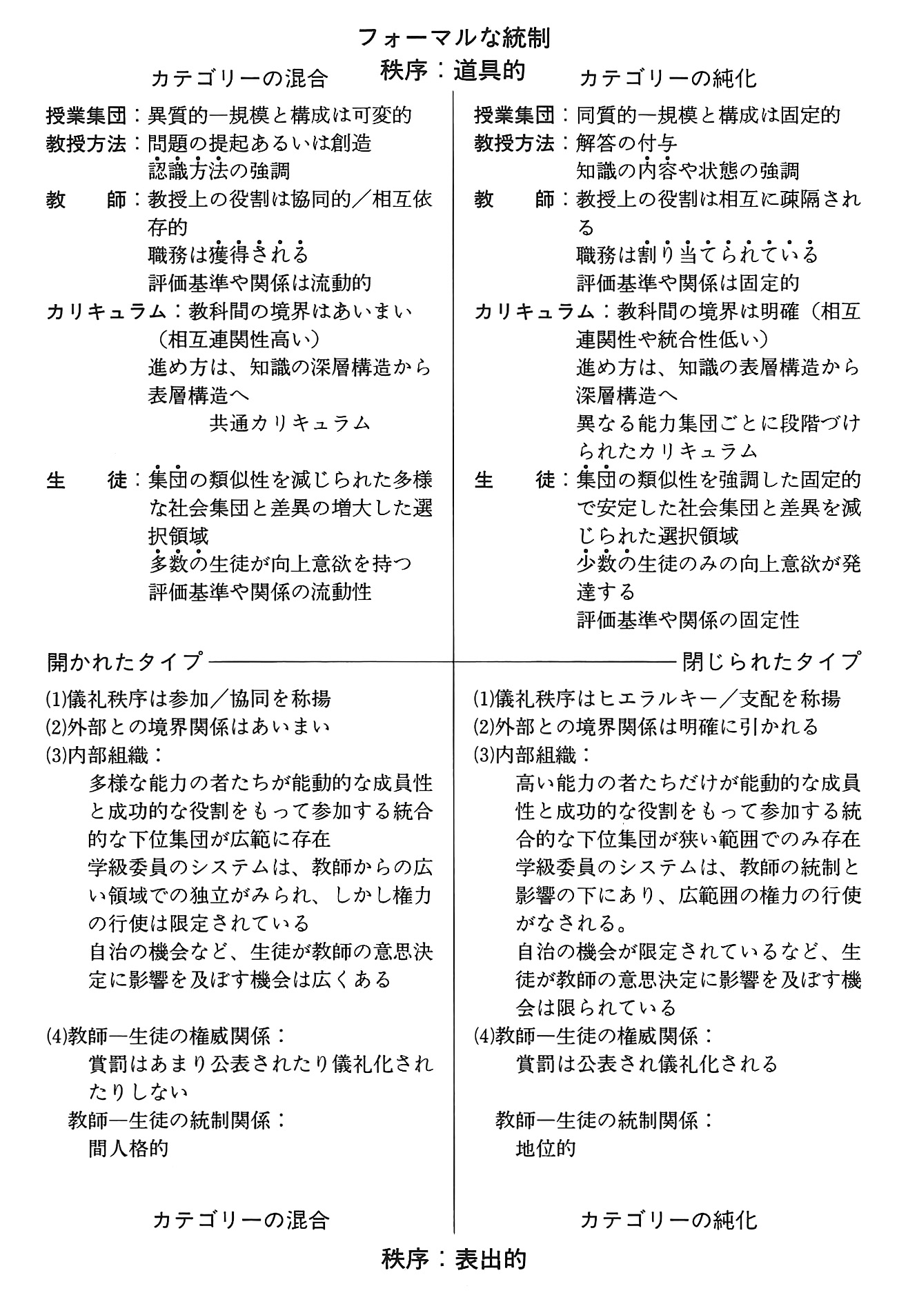 この図の下段(秩序:表出的)をみると、学校儀礼のきわめて対照的な姿が描かれている。右欄、閉じられたタイプではヒエラルキー/支配が称揚され、外部との境界は明確で、高い能力を持つものが狭い範囲で存在し、教師の統制下にあり(広く権力が行使される)、自治の機会は限定される。教師と生徒の権威関係をみると賞罰は公表・儀礼化され、両者は地位的な関係で結ばれる。他方、左欄、開かれたタイプでは参加/協同が称揚され、外部との境界はあいまいで、多様な能力を持つ者たちが能動的に参加し、教師から独立的で(権力行使は限定される)、自治的な機会がある。教師と生徒の権威関係をみると賞罰は公表・儀礼化されず、両者は間人格的な関係で結ばれる。