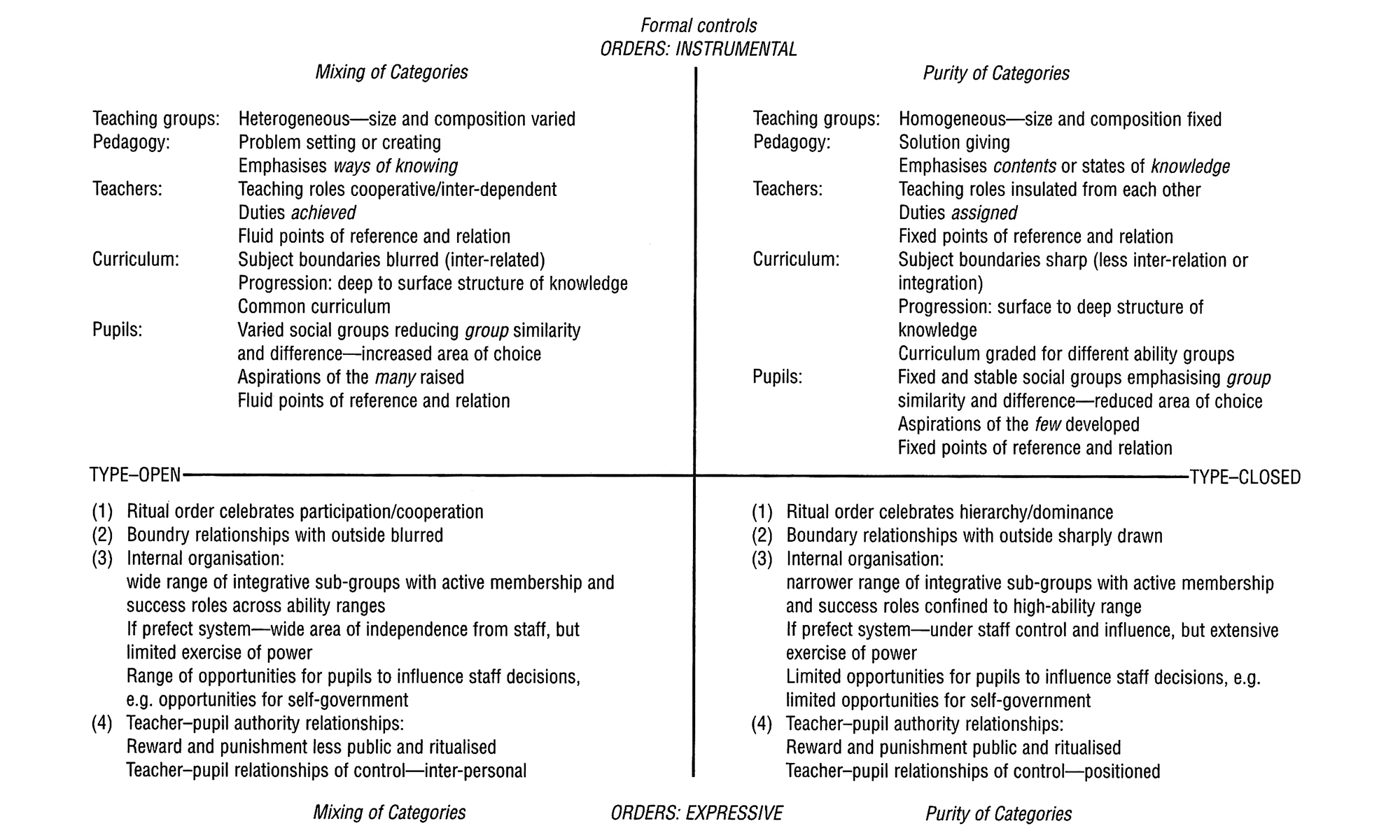 先にみた成層化された学校は閉じられたタイプ、差異内包的な学校は開かれたタイプに対応する、と考えてもよいだろう。前者から後者への転換は「常に表出的秩序の変化をふくむものではないが、それが伝達される手段の変化をふくむことは明らかである」とされる。つまり学校儀礼のあり方が両者の間でかなり異なったものになってくるということである。成層化された学校における表出的秩序の伝達は「高度に濃縮された肥沃なコミュニケーション体系〔儀礼〕をとおして伝達される〔官僚制的〕。個性化された学校の表出的秩序は……〔儀礼ではなく〕より個性化されたコミュニケーション体系をとおして伝達される傾向がある〔個人的治療型〕」(バーンスティン訳書1977=1985:72-75)。